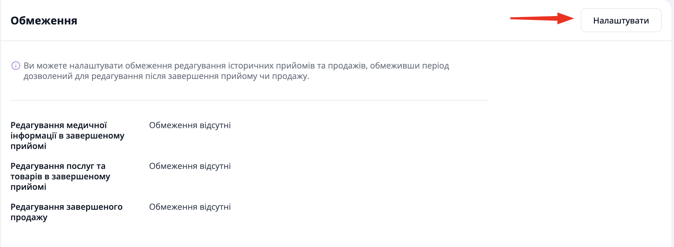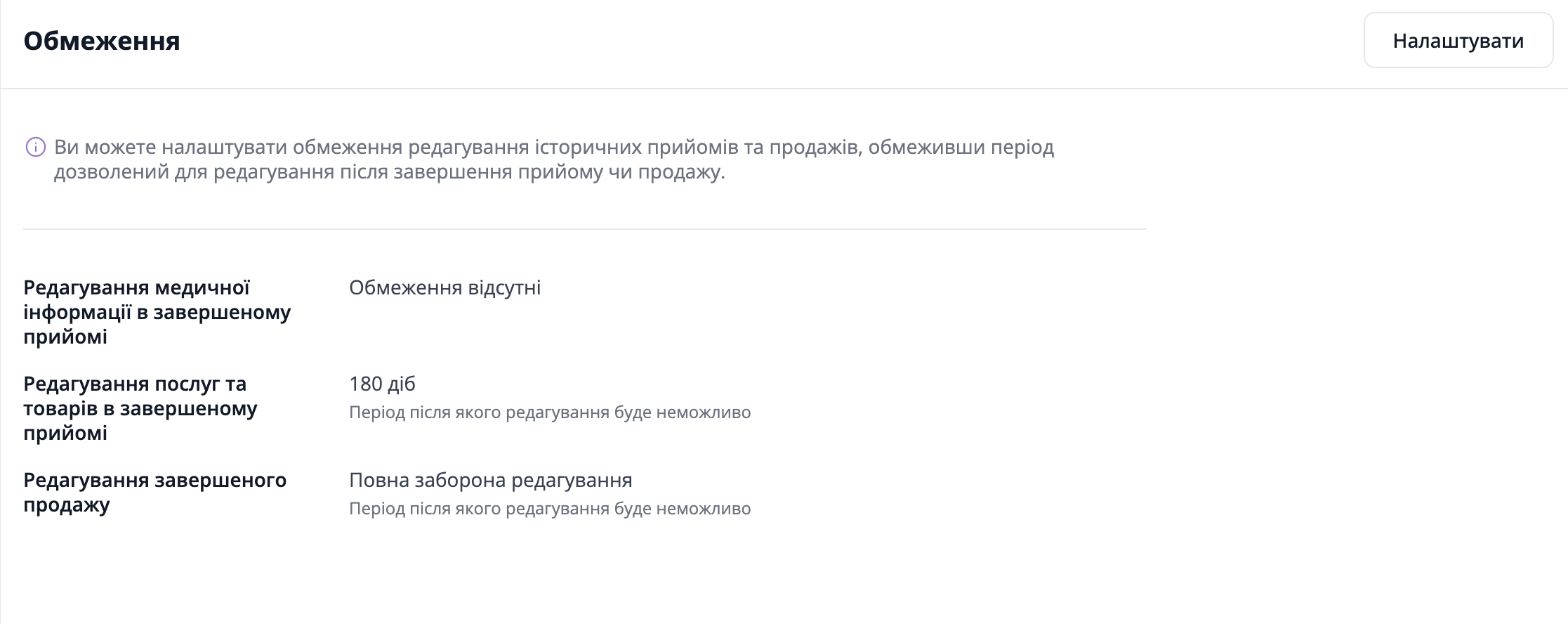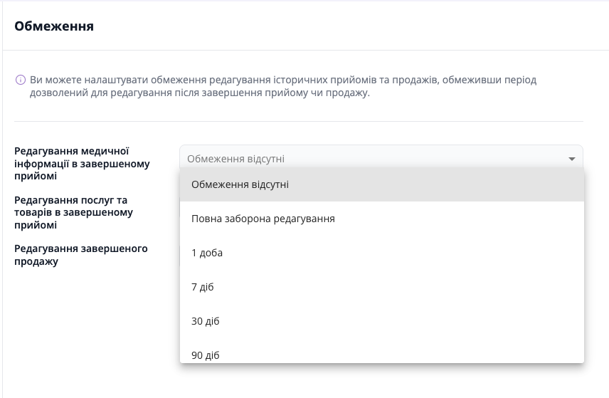 В цьому розділі ви можете налаштувати обмеження для редагування історичних прийомів та продажів, обравши період дозволений для редагування після завершення прийому чи продажу.