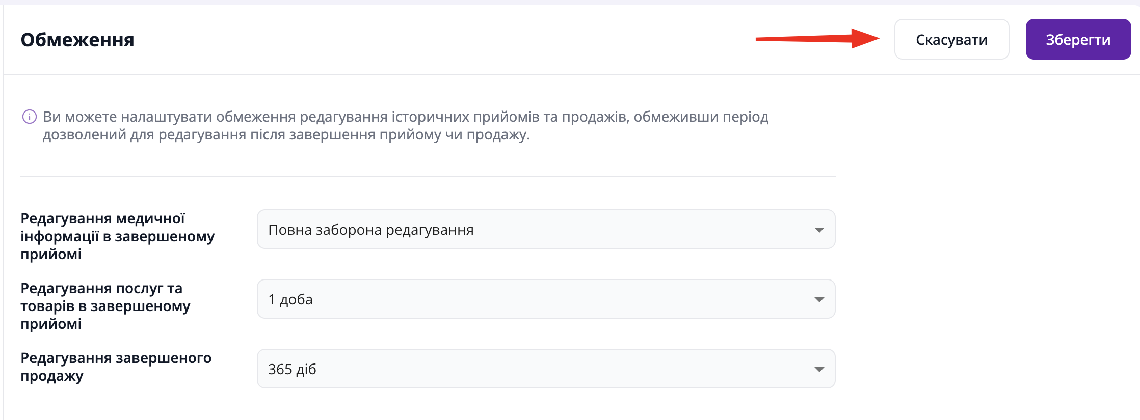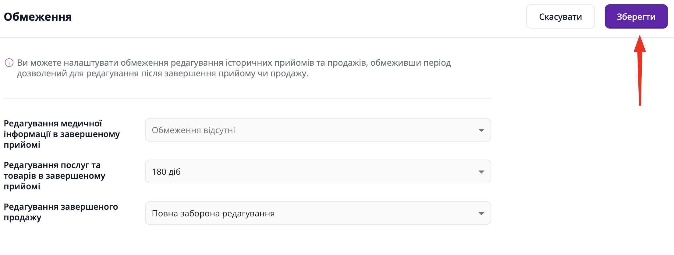 - Редагування послуг та товарів в завершеному прийомі - налаштоване обмеження буде діяти тільки для вкладки "Послуги та товари" в завершеному прийомі.