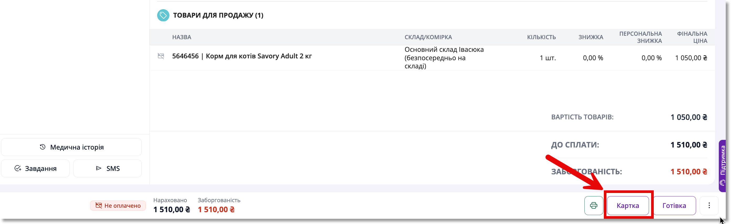Перейдіть у картку прийому, який оплачує клієнт, та натисніть кнопку "Картка".