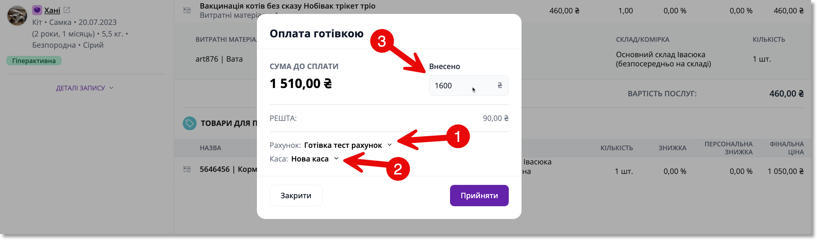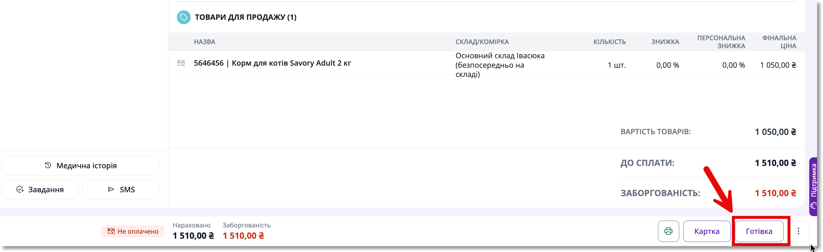 Перейдіть у картку прийому, який оплачує клієнт, та натисніть кнопку "Готівка".
