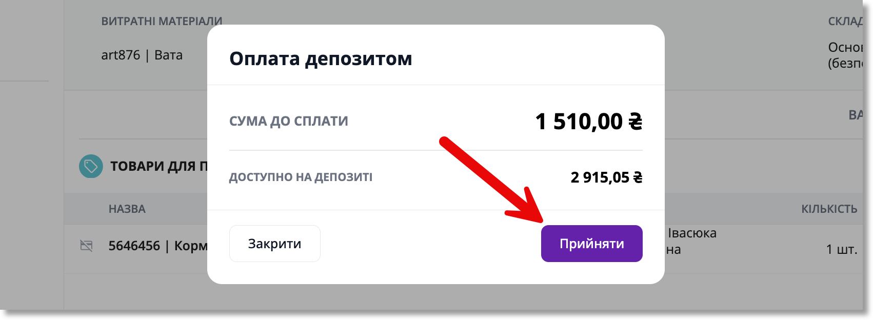 Прийняття оплати депозитом можливе лише у випадку, якщо суми депозиту клієнта вистачає для прийняття всієї оплати