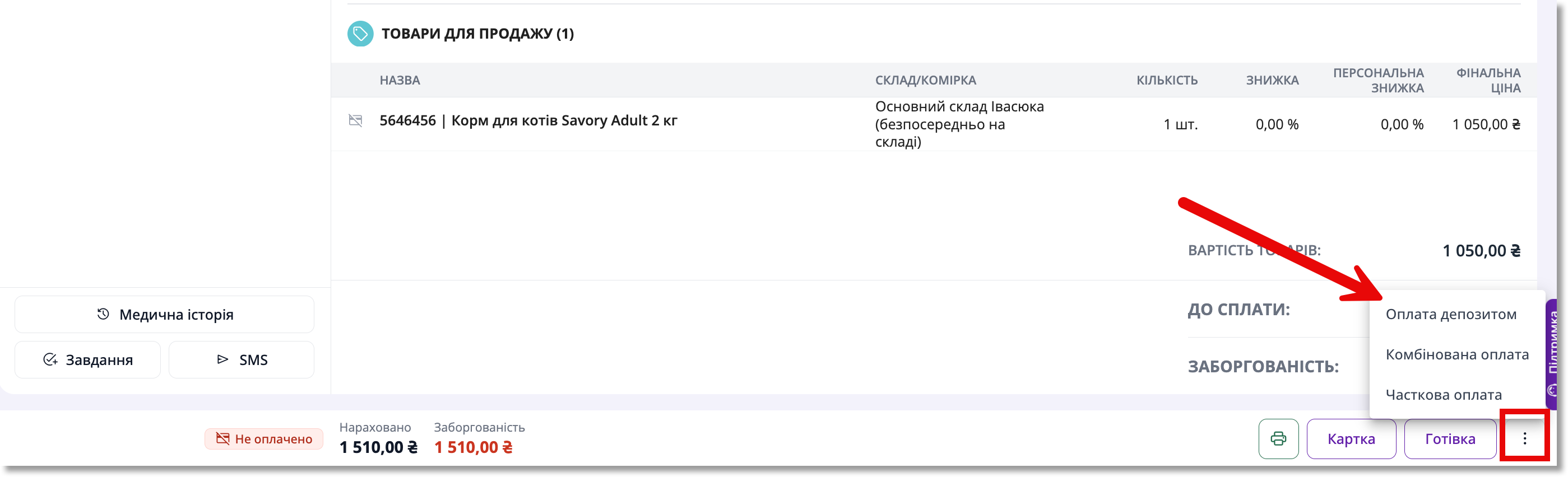 Перейдіть у картку прийому, який оплачує клієнт, натисніть на три крапки та оберіть "Оплата депозитом".