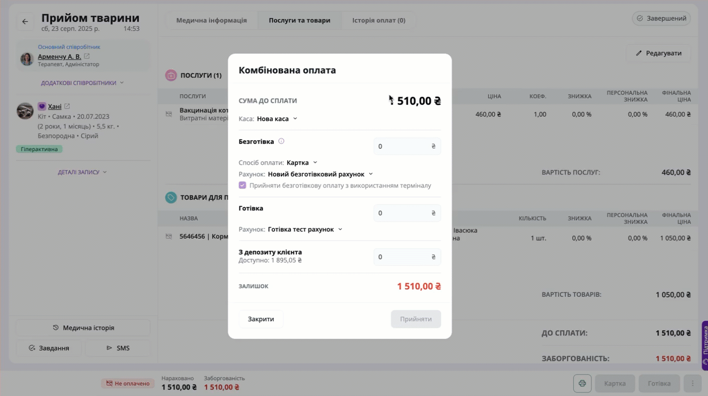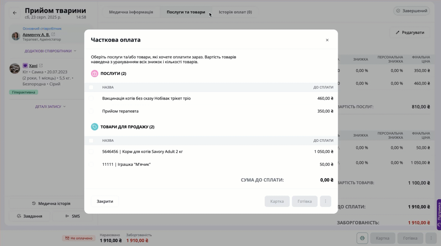Прийняття оплати від клієнта доступне після завершення прийому. Ви можете зафіксувати повну або часткову оплату прийому.
