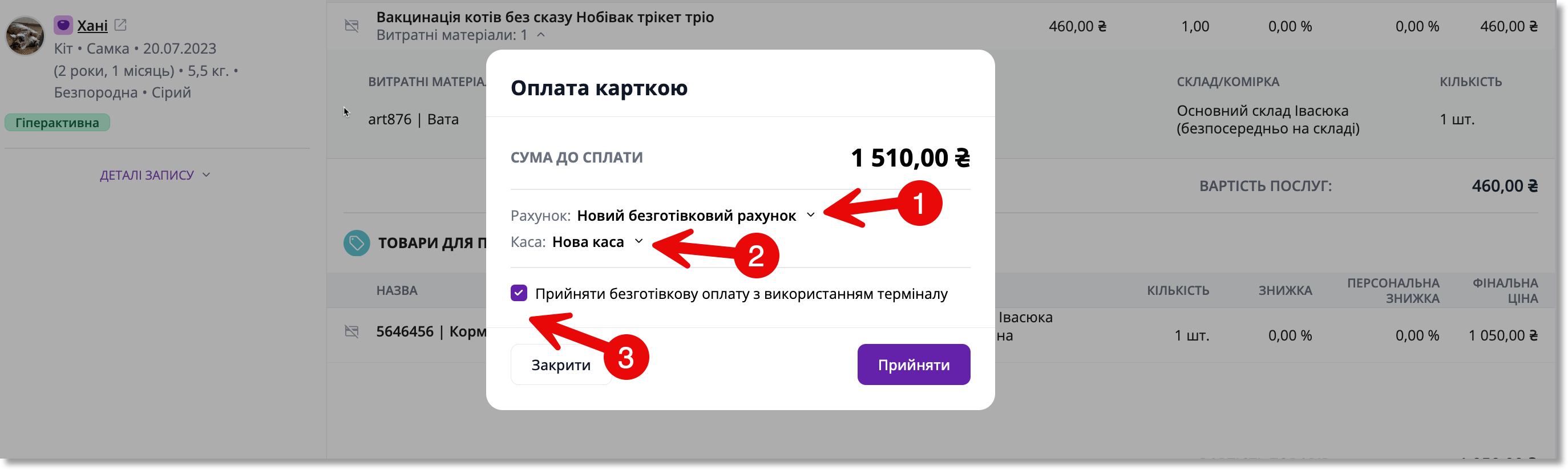 Якщо ви обрали касу, для якої налаштовано pos-термінал, за замовчуванням, така оплата буде прийнята на термінал. Якщо ви хочете прийняти оплату без терміналу - зніміть відповідну галочку (3). Натисніть "Прийняти".