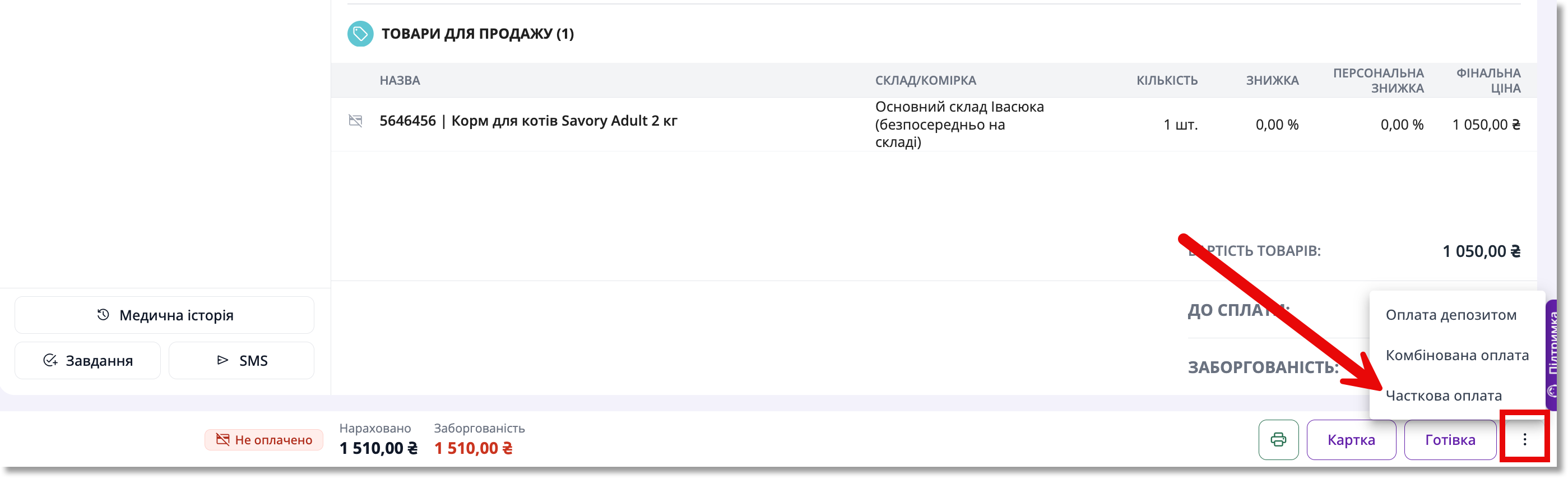 Перейдіть у картку прийому, який оплачує клієнт, натисніть на три крапки та оберіть "Часткова оплата".