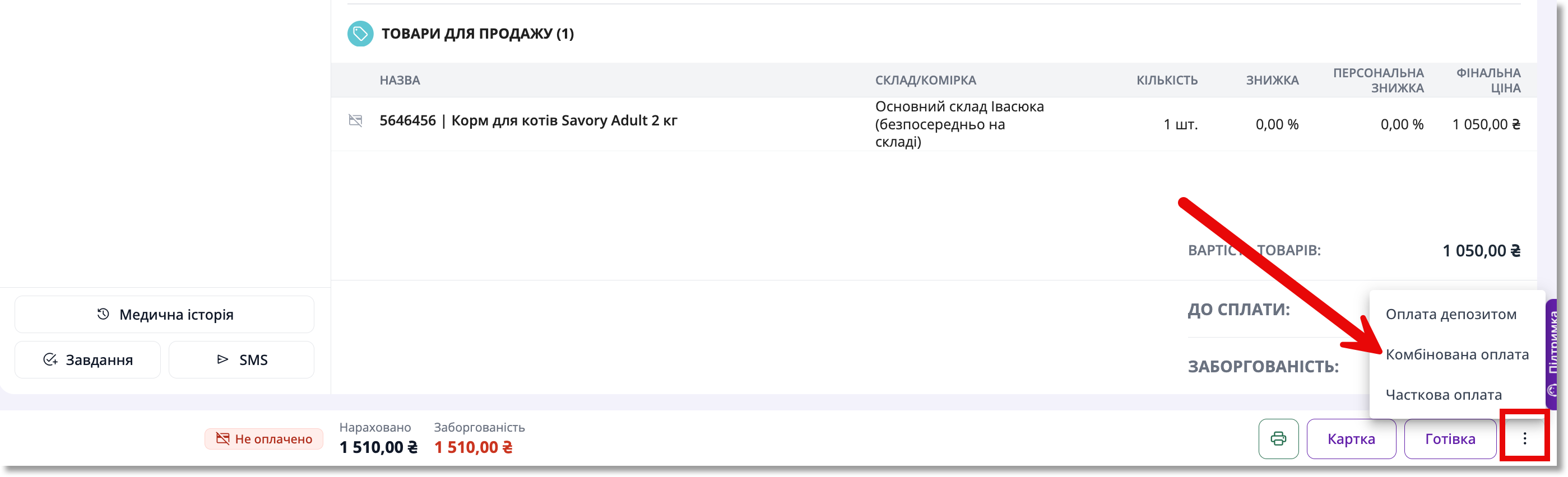 Для цього перейдіть у картку прийому, який оплачує клієнт, натисніть на три крапки та оберіть "Комбінована оплата".