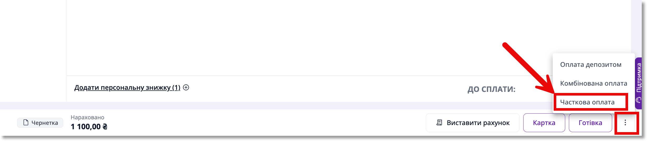 Перейдіть у картку продажу, який оплачує клієнт, натисніть на три крапки та оберіть "Часткова оплата".