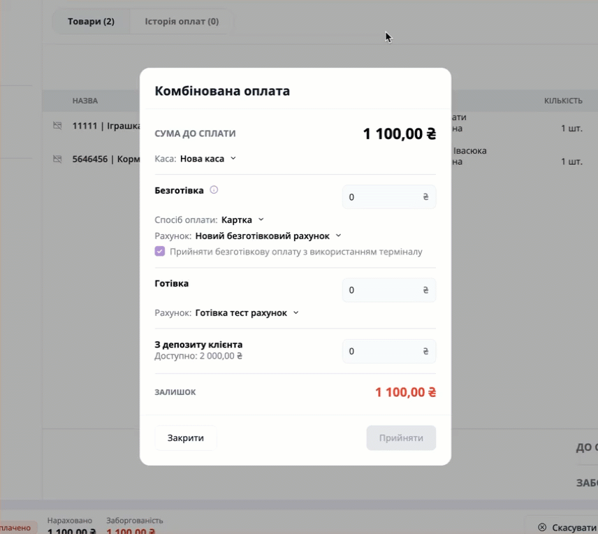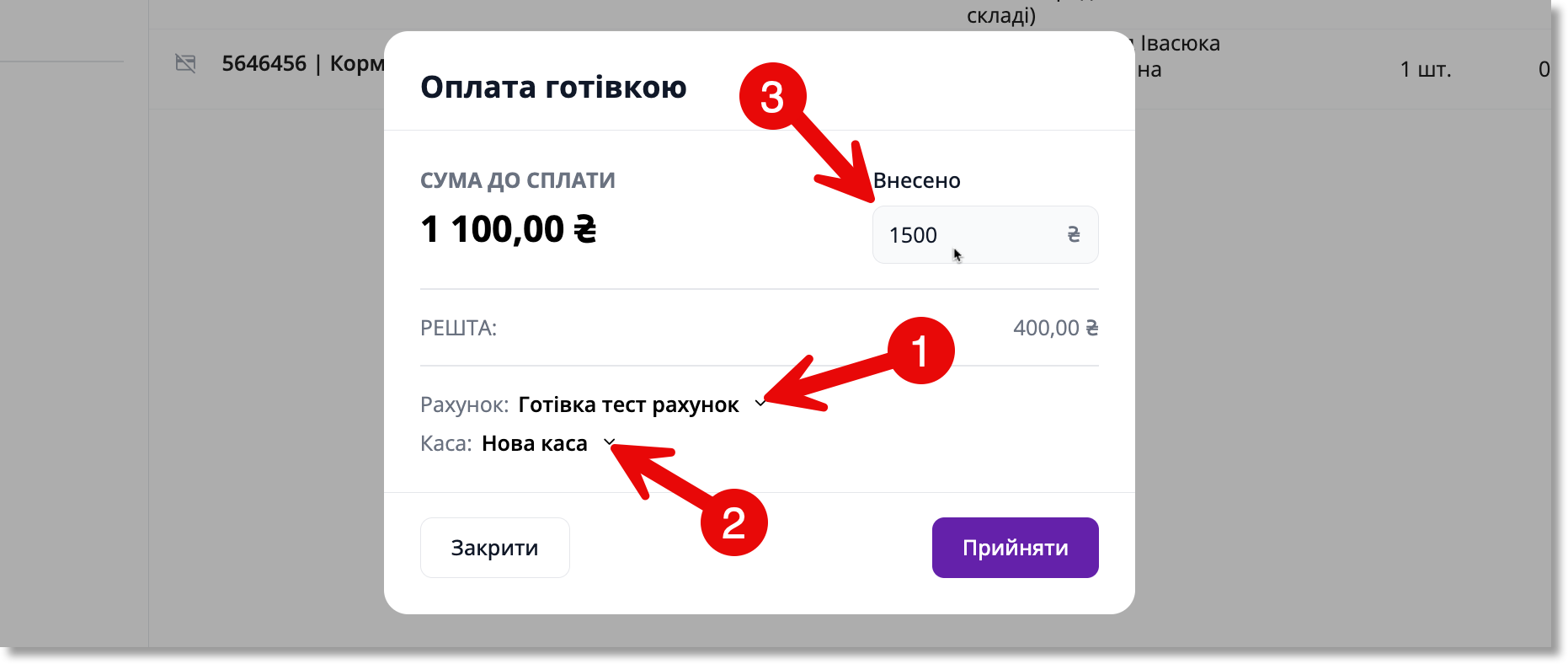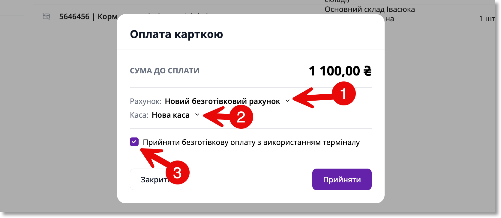 Якщо ви обрали касу, для якої налаштовано pos-термінал, за замовчуванням, така оплата буде прийнята на термінал. Якщо ви хочете прийняти оплату без терміналу - зніміть відповідну галочку (3). Натисніть "Прийняти".