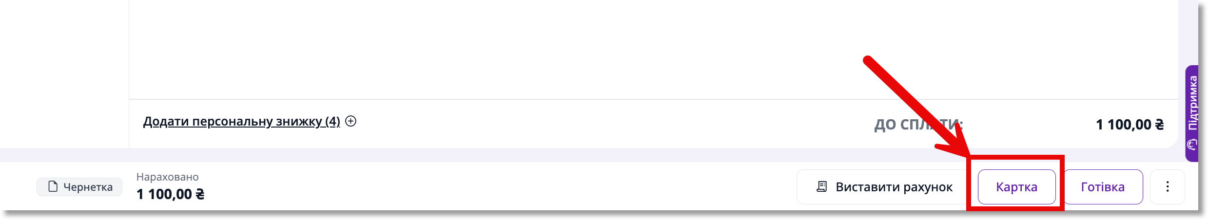 Перейдіть у картку продажу, який оплачує клієнт, та натисніть кнопку "Картка".