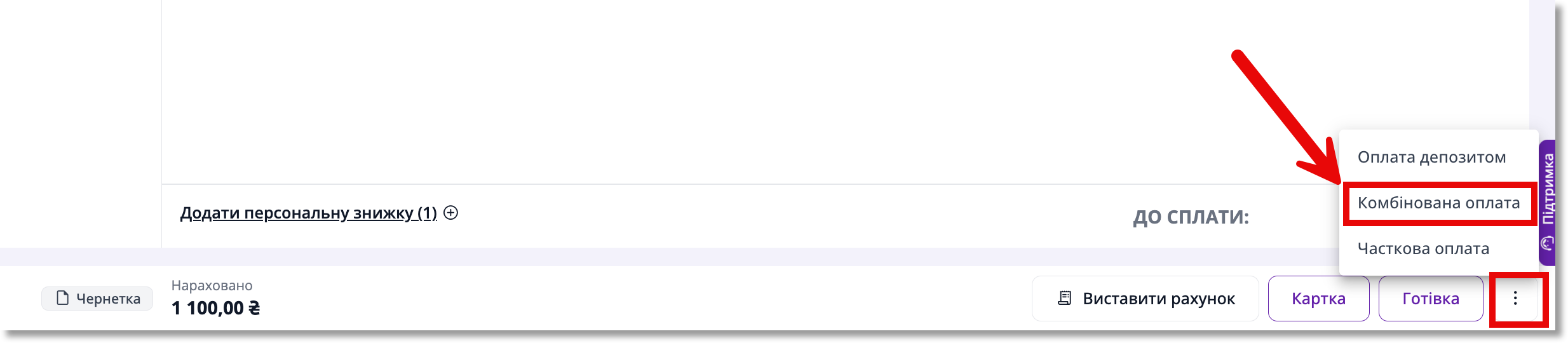 Для цього перейдіть у картку продажу, який оплачує клієнт, натисніть на три крапки та оберіть "Комбінована оплата".