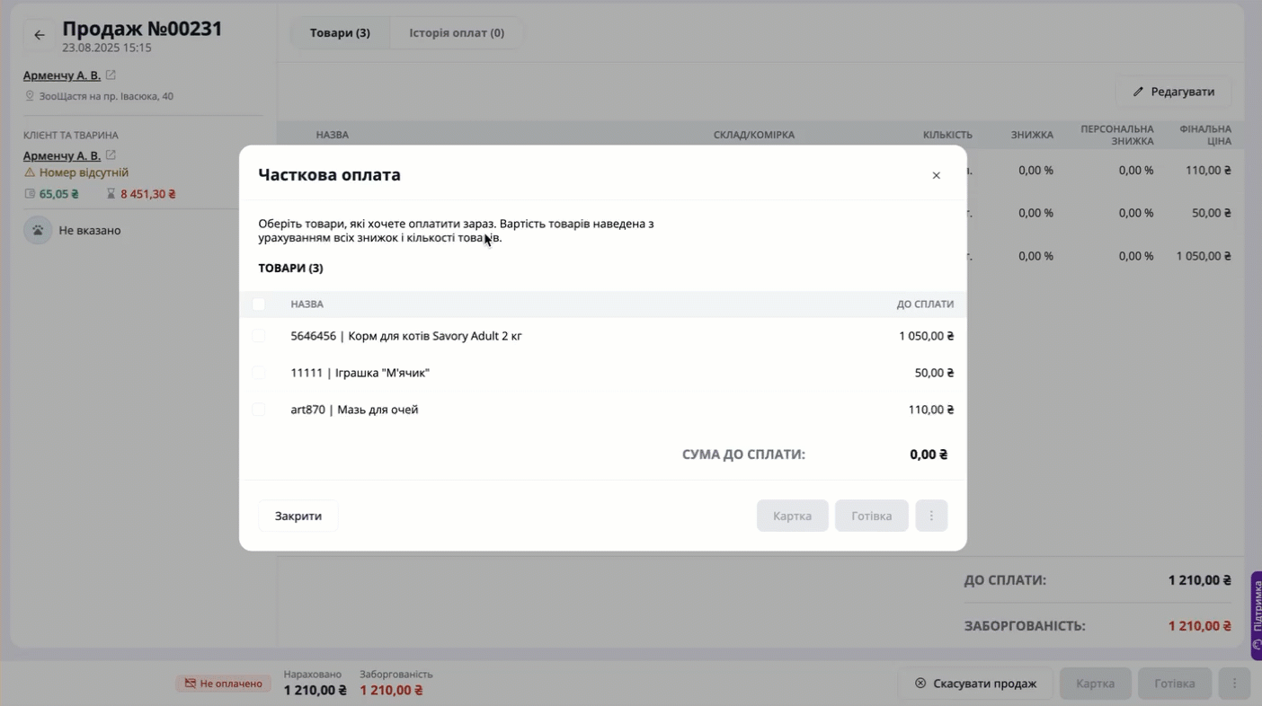 Оберіть товари, які оплачує клієнт. Система автоматично розрахує суму оплати, яка буде прийнята.