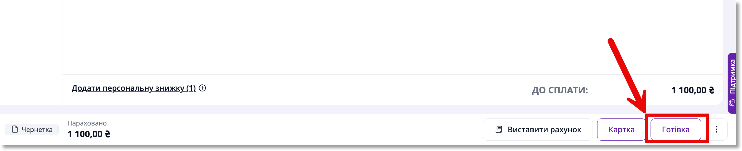 Перейдіть у картку продажу, який оплачує клієнт, та натисніть кнопку "Готівка".
