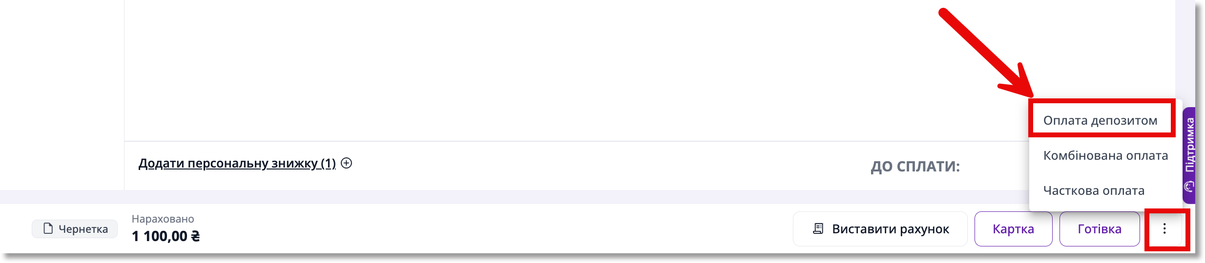 Перейдіть у картку продажу, який оплачує клієнт, натисніть на три крапки та оберіть "Оплата депозитом".