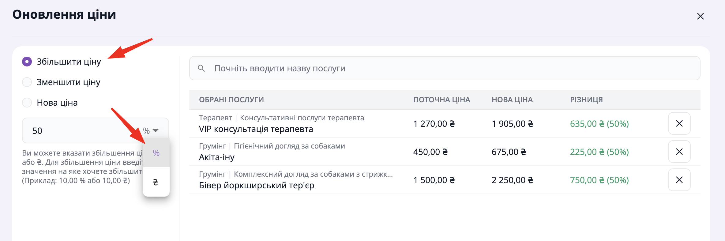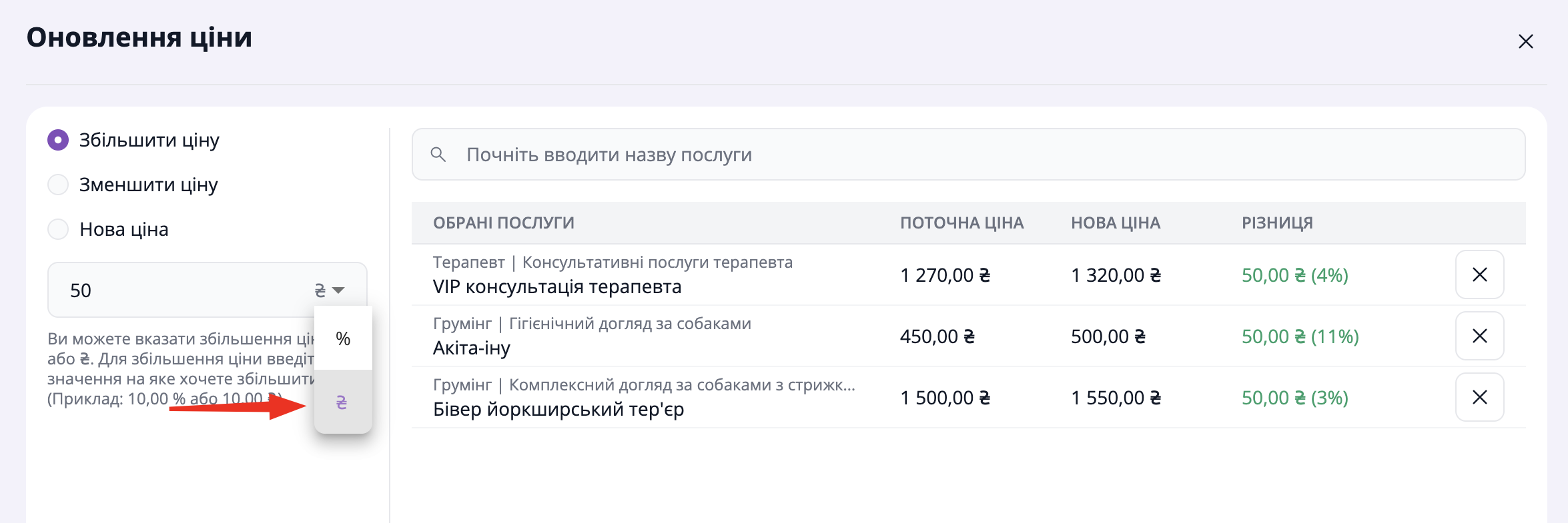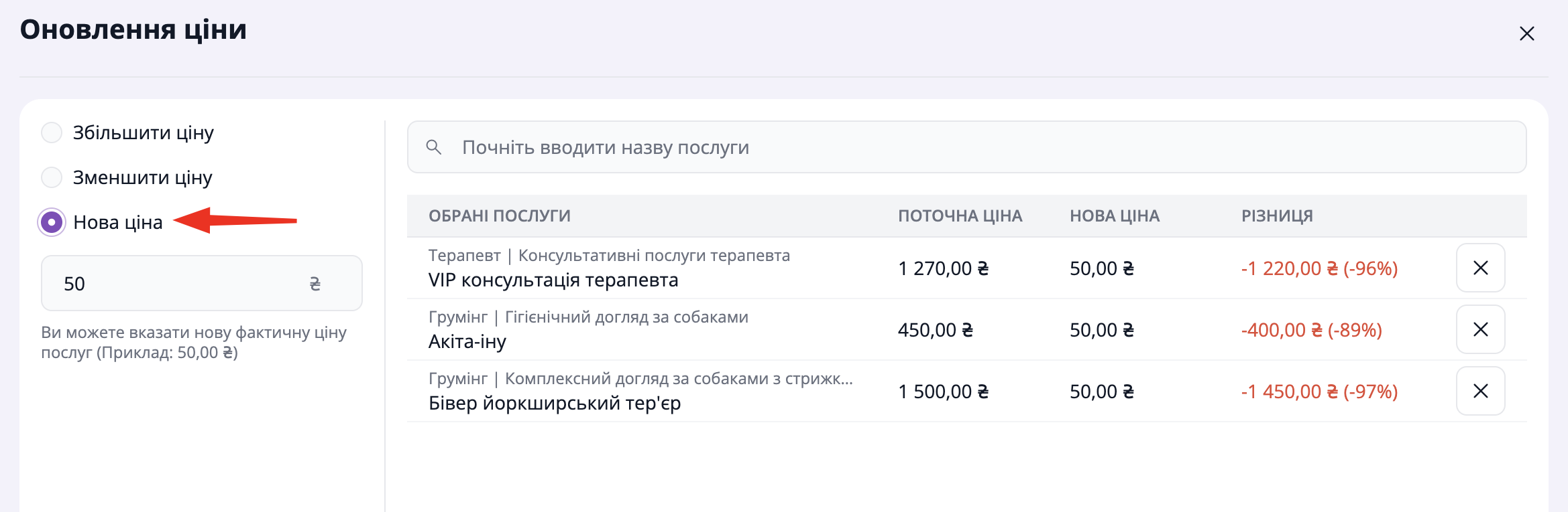 Також ви можете керувати списком обраних послуг: видалити ті, для яких не потрібно оновлювати ціну, або додати нові.