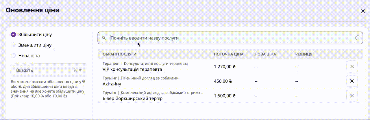 Ви можете оновити ціну одразу для кількох послуг. Для цього:
