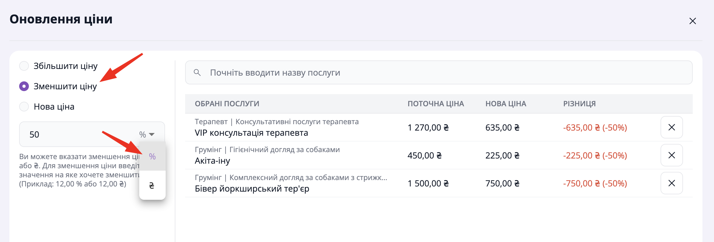 Ви можете зменшити ціну у відсотковому значенні, обравши відповідний параметр "Зменшити ціну" та "%".