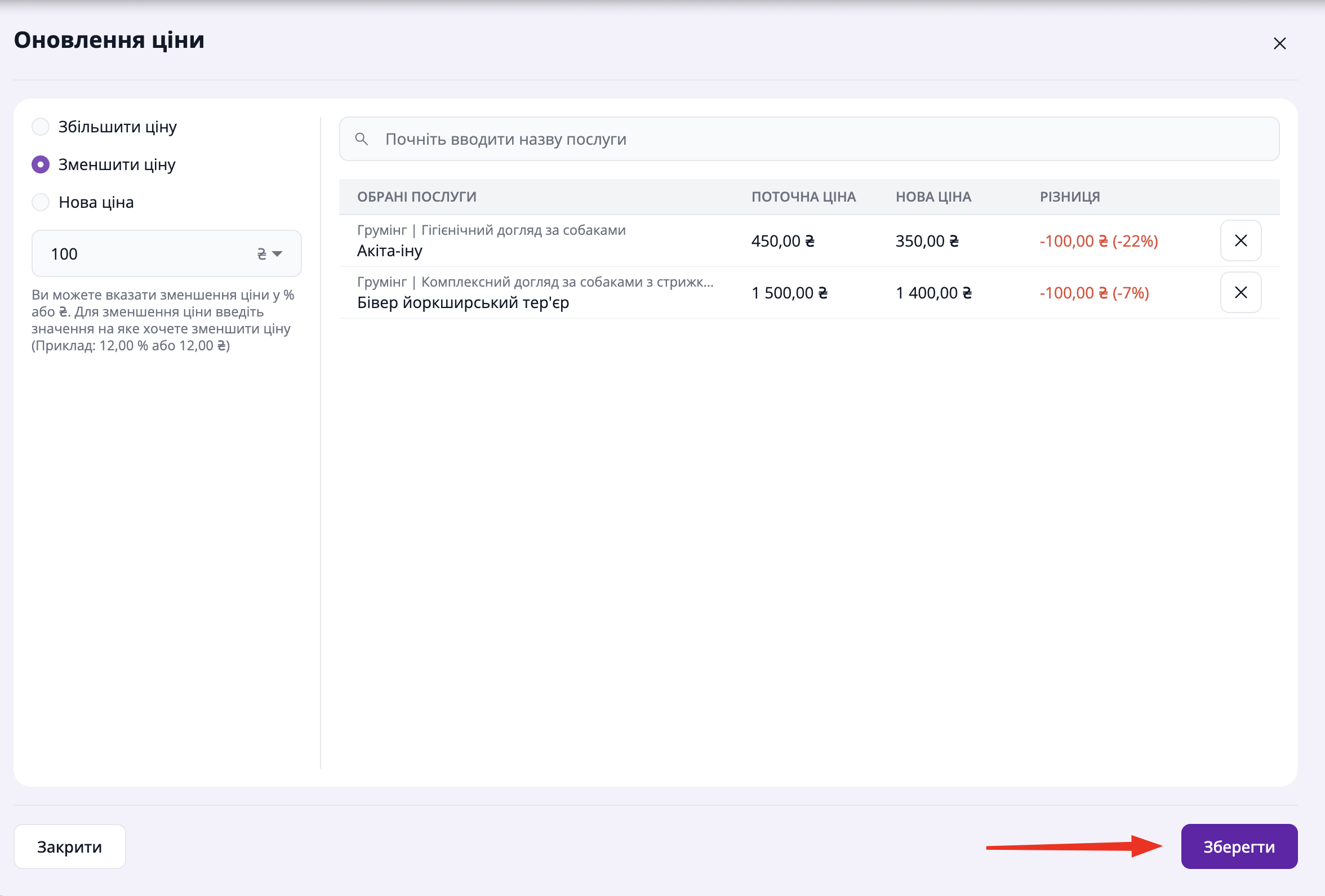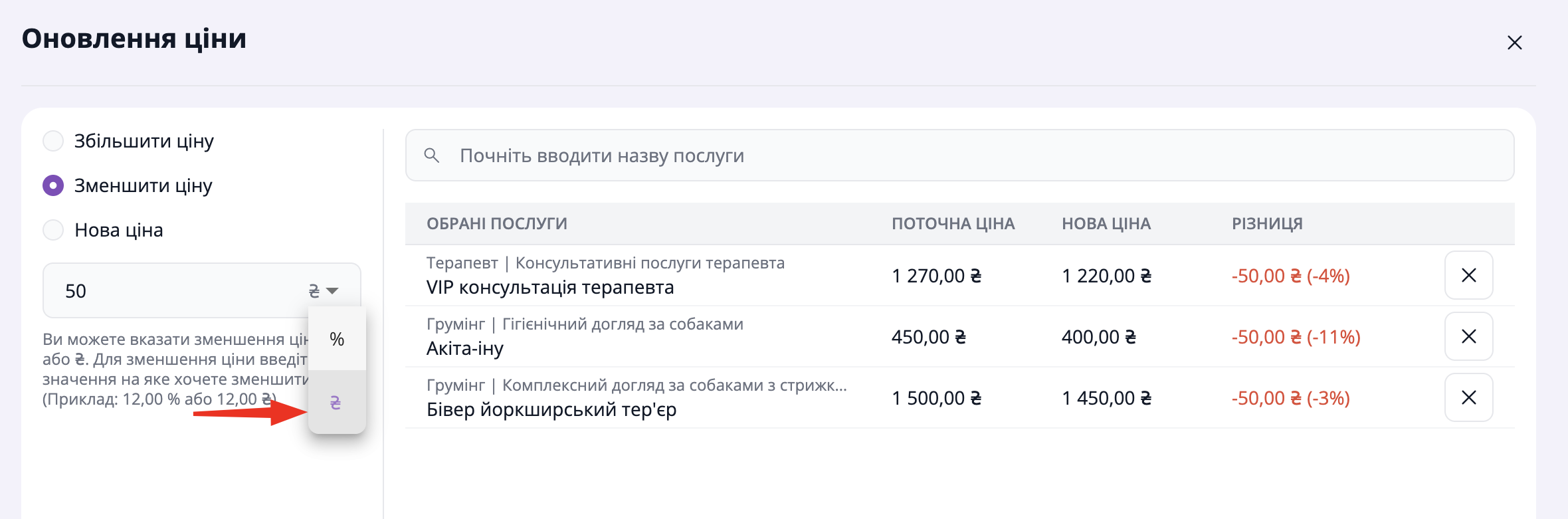 Система одразу відображає різницю поточної та нової ціни
