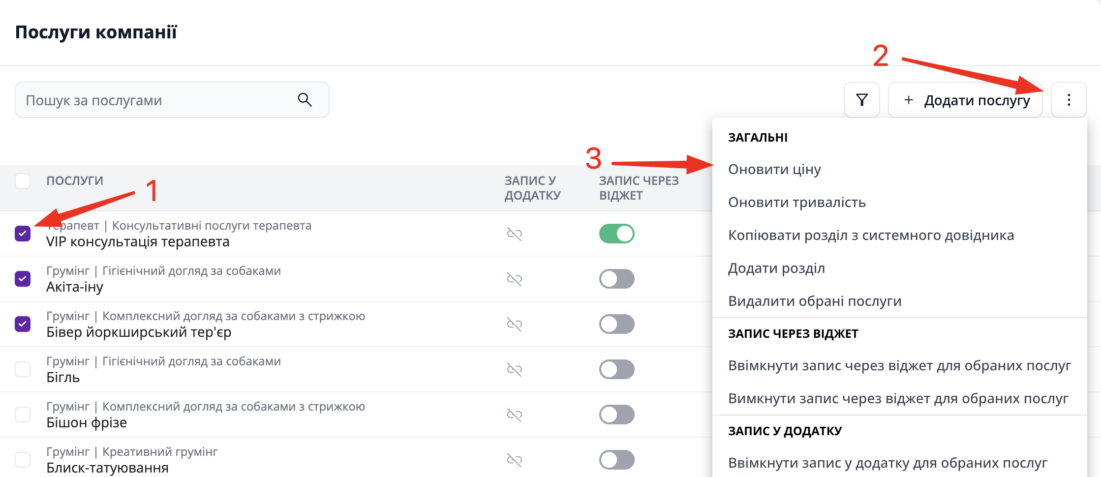 (1) оберіть необхідні послуги, (2) натисніть на три крапки та (3) оберіть "Оновити ціну".