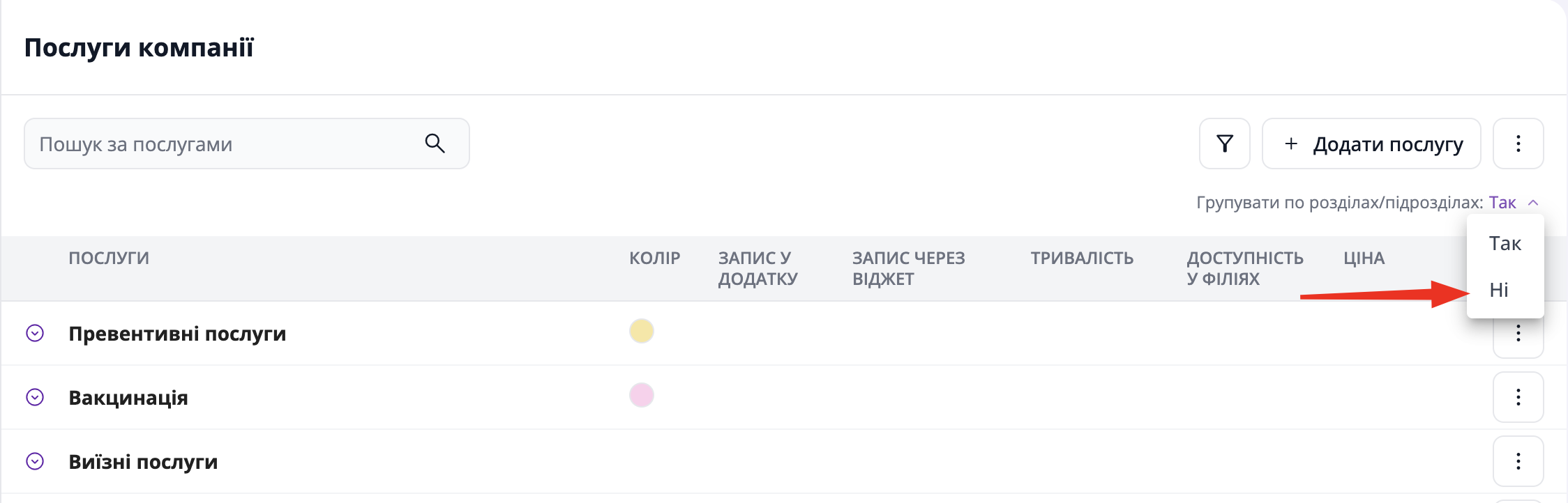 В потрібному розділі натисніть на три крапки та оберіть "Додати послугу в цей розділ".