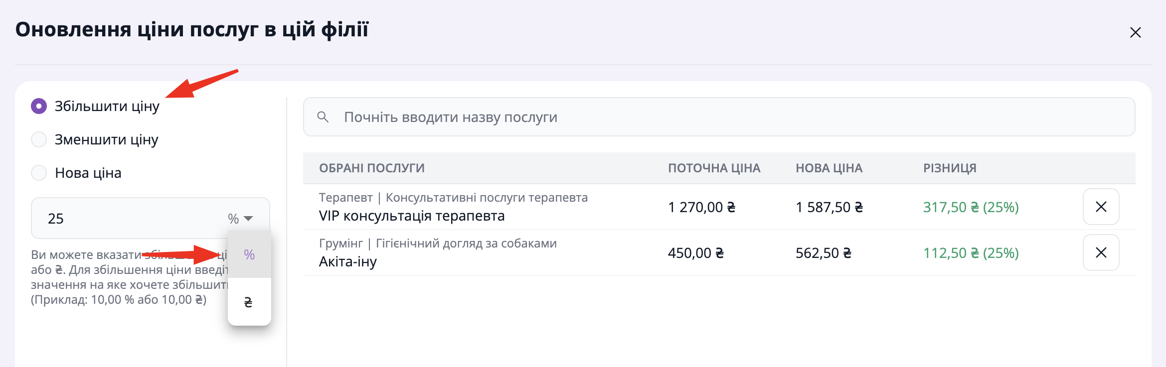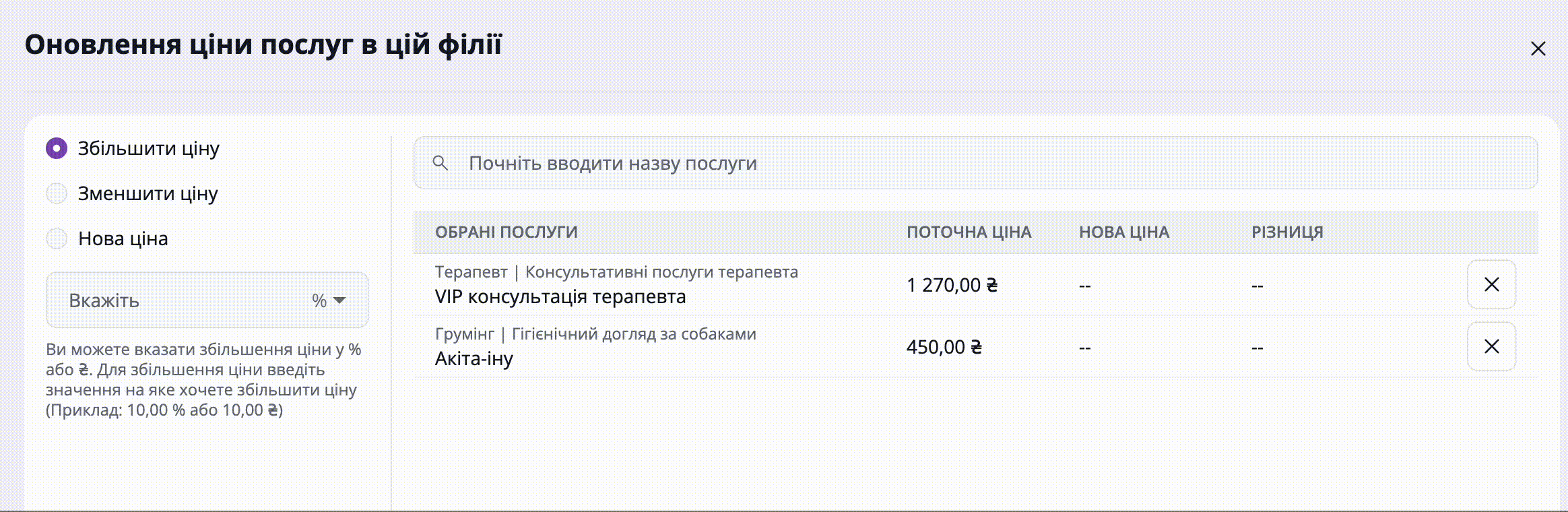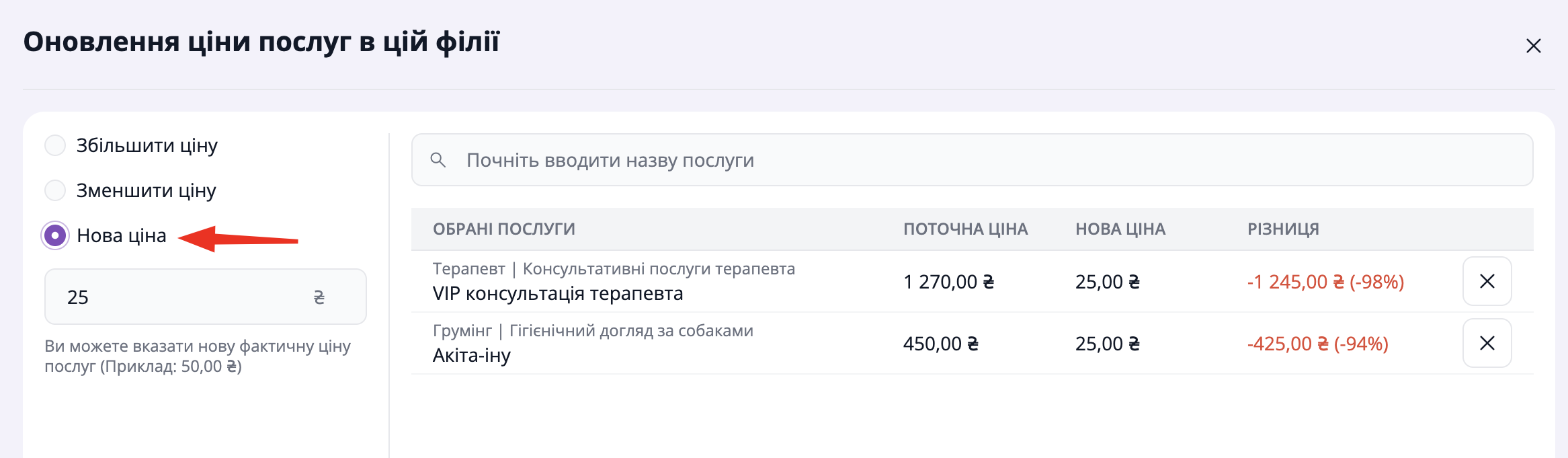 Відкриється вікно оновлення ціни, у якому будуть відображені всі послуги філії, обрані на попередньому кроці.