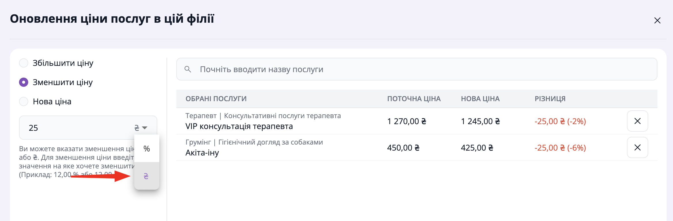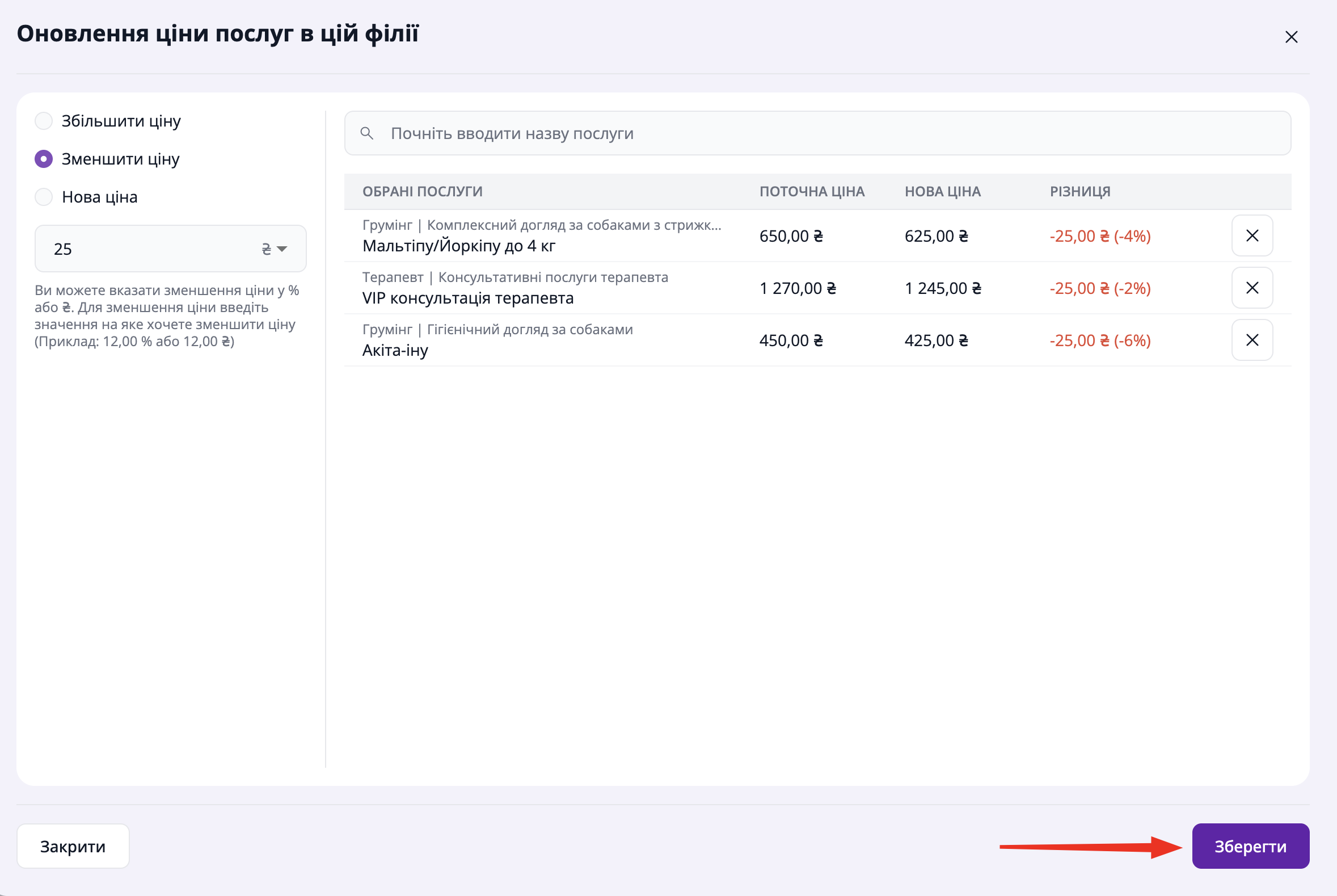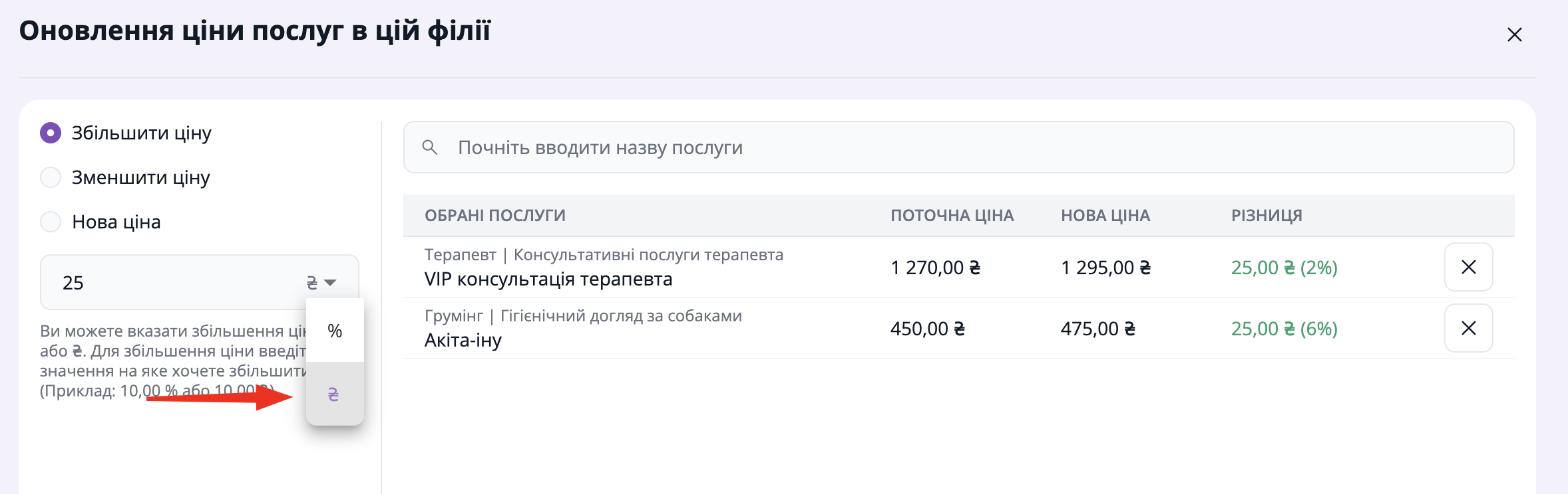 Відкриється вікно оновлення ціни, у якому будуть відображені всі послуги філії, обрані на попередньому кроці.