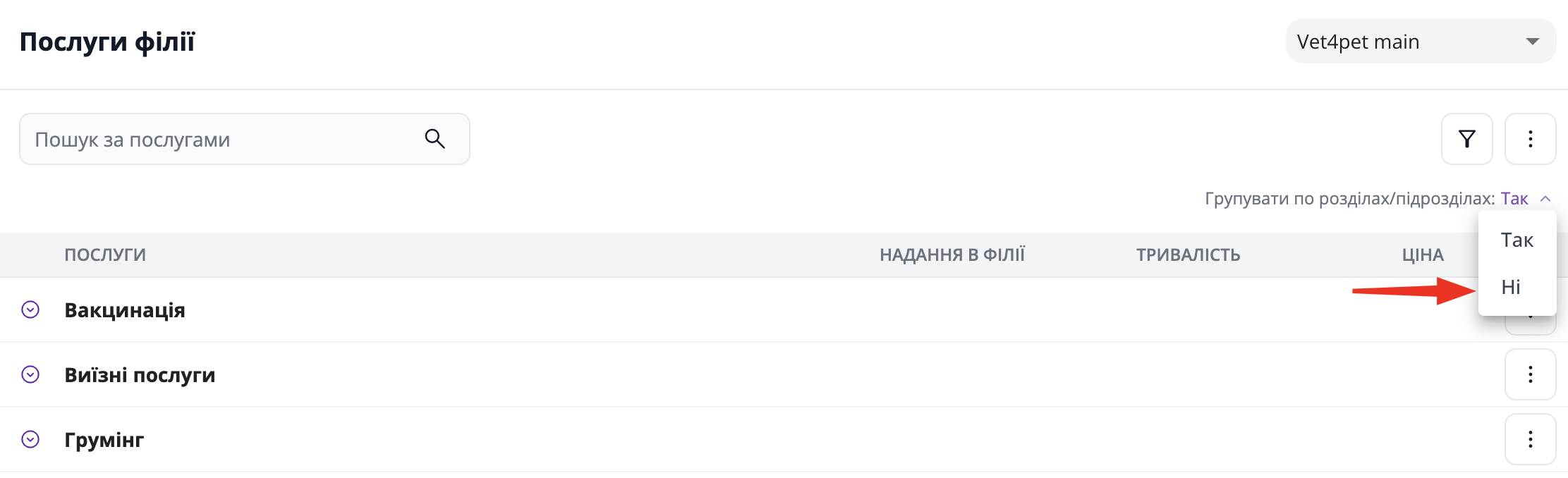 У розділі "Налаштування" перейдіть до підрозділу "Послуги філії". У правому верхньому кутку скористайтеся фільтром, щоб обрати потрібну філію.