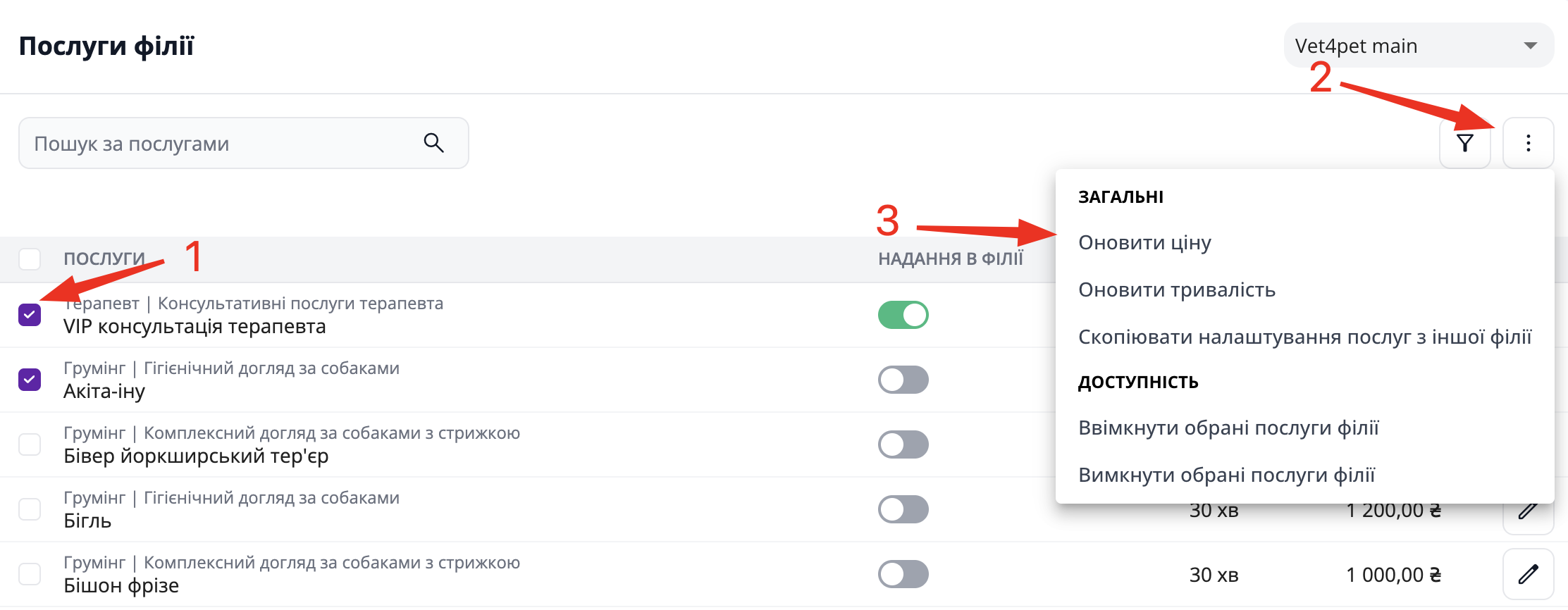 Ви можете оновити ціну одразу для кількох послуг філії. Для цього: