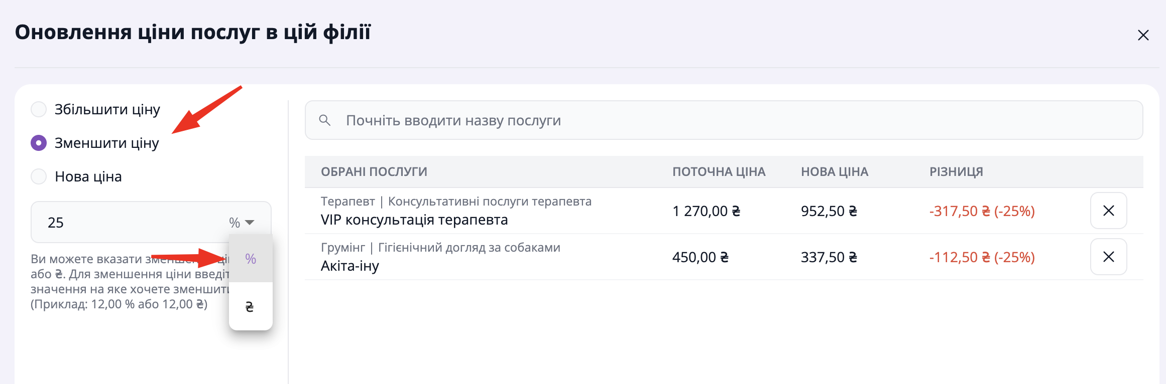 Ви можете зменшити ціну у відсотковому значенні, обравши відповідний параметр "Зменшити ціну" та "%".
